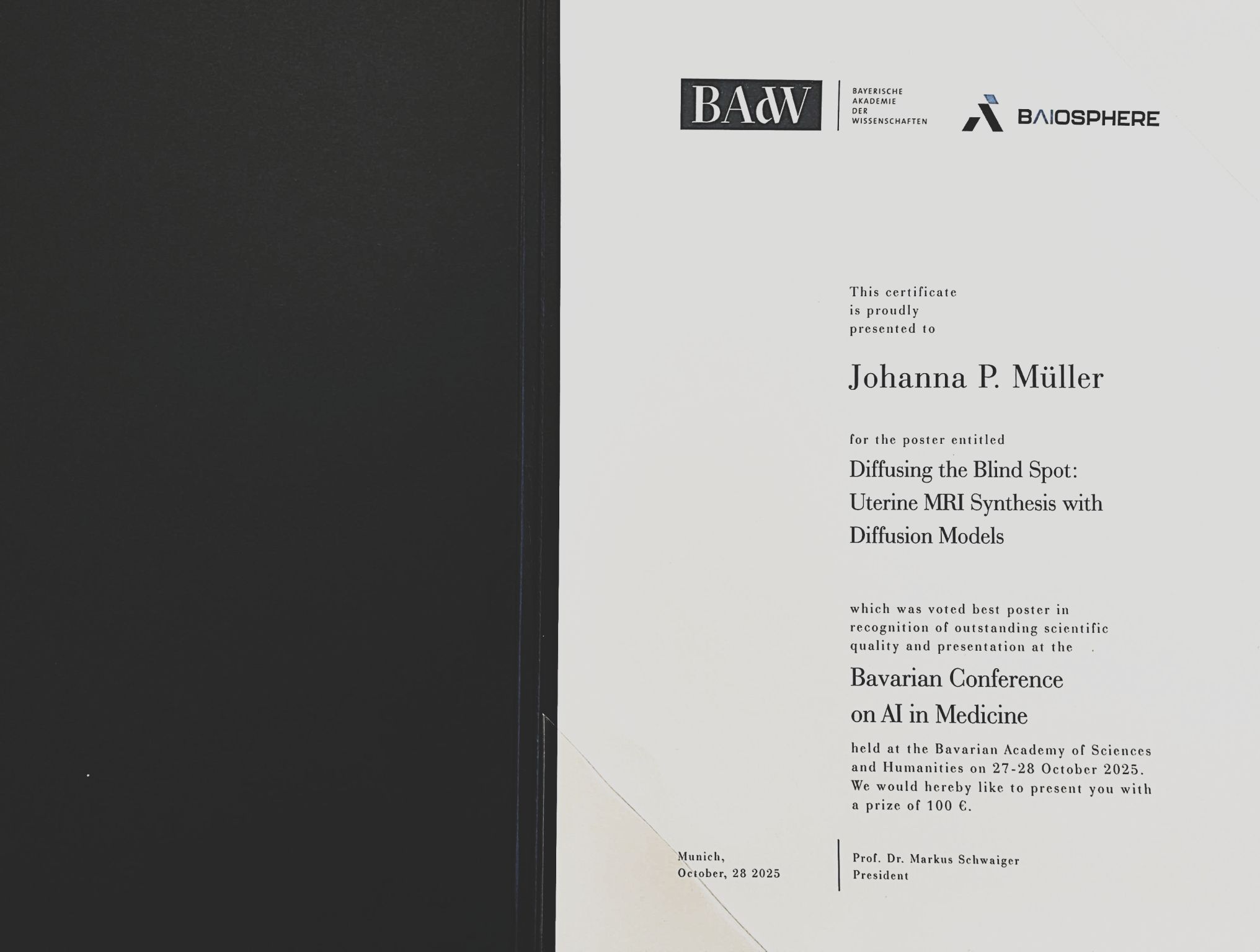 We are excited to share that our PhD student, Johanna P. Müller, from the IDEA Lab, received a Best Poster Award at the Bavarian Conference on AI in Medicine, held on 27–28 October 2025 in Munich. Her poster, “Diffusing the Blind Spot: Uterine MRI Synthesis with Diffusion Models”, was selected by conference participants as one […]We are excited to share that our PhD student, Johanna P. Müller, from the IDEA Lab, received a Best Poster Award at the Bavarian Conference on AI in Medicine, held on 27–28 October 2025 in Munich. Her poster, “Diffusing the Blind Spot: Uterine MRI Synthesis with Diffusion Models”, was selected by conference participants as one […]